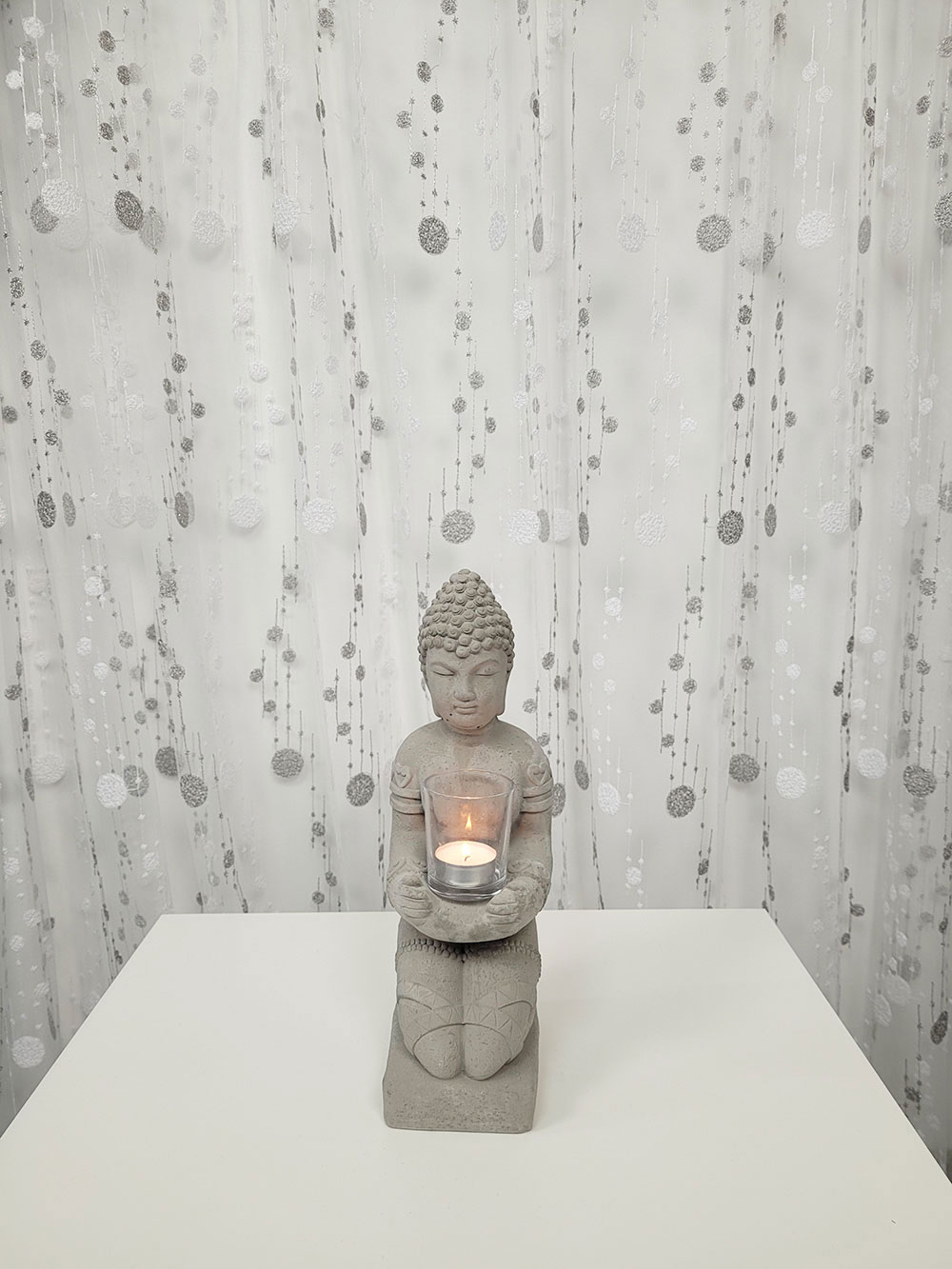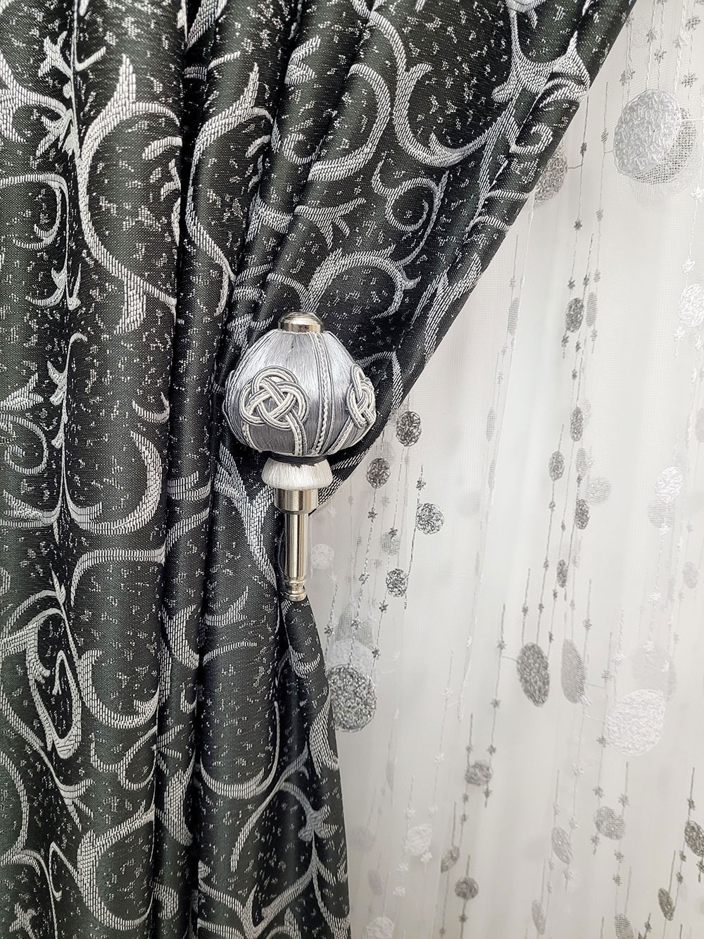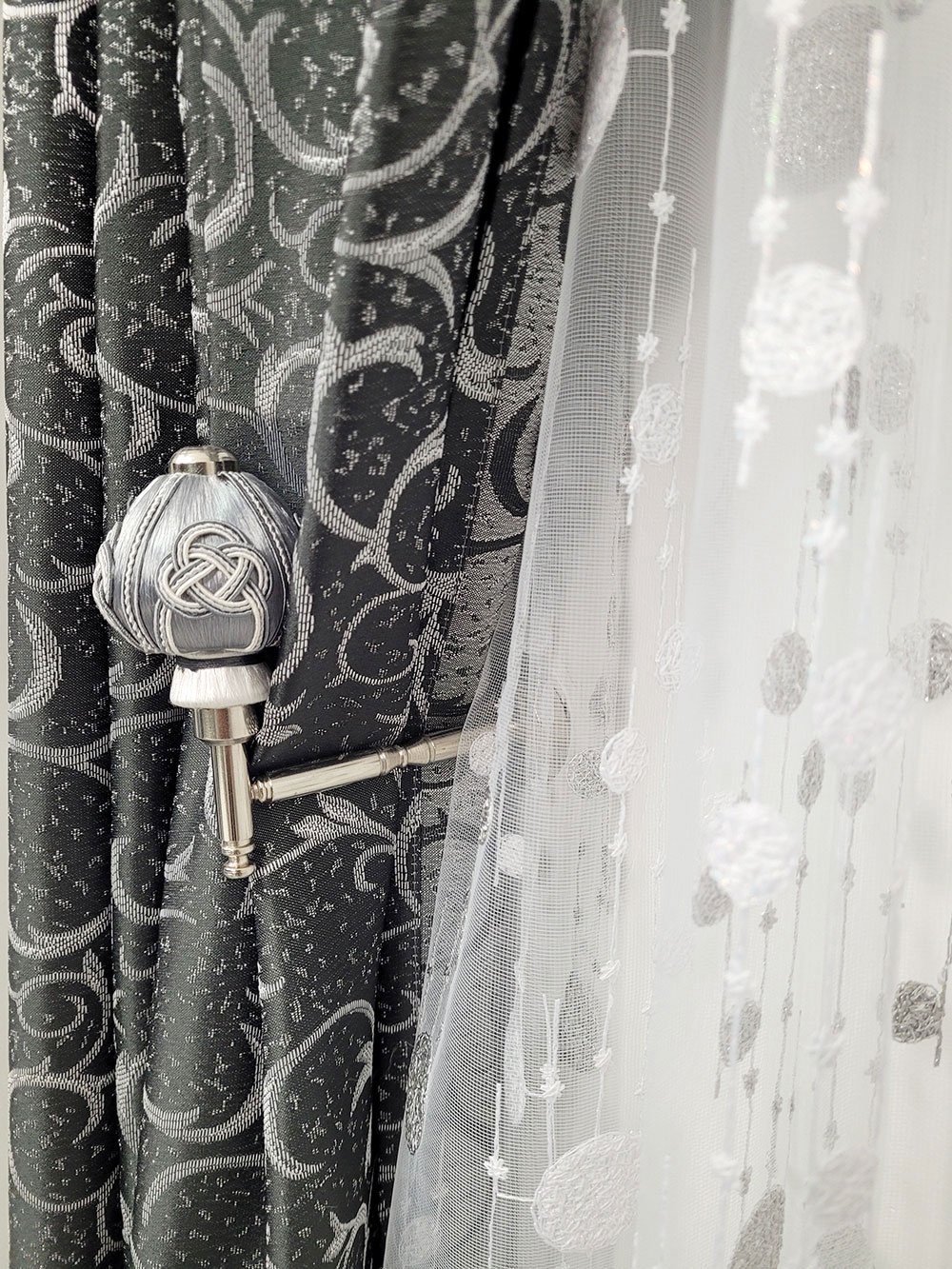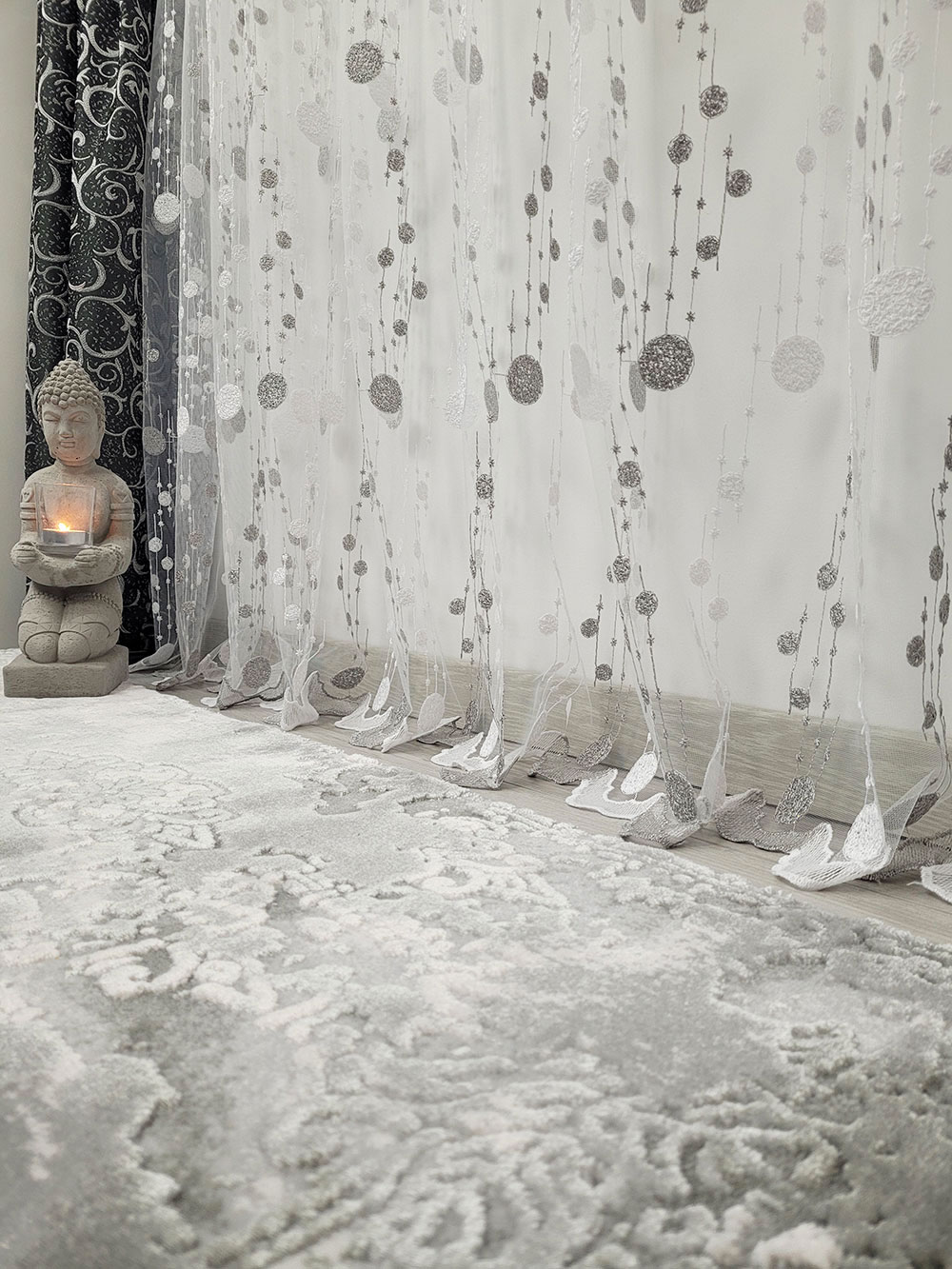 Perdea alba cu buline gri, cu carlig